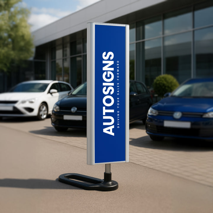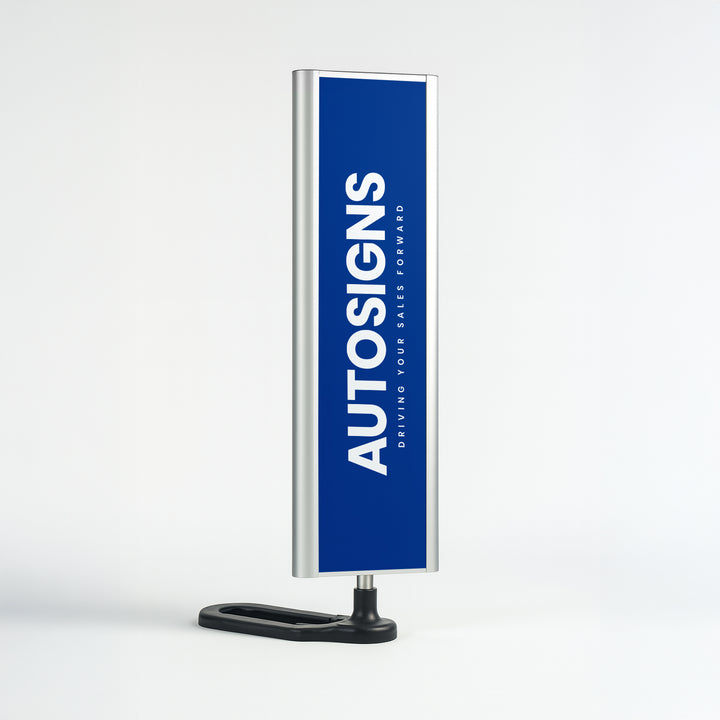 1.3m totem display includes aluminium frame, base and a pair of interchangeable panels printed in full colour on 3mm Foamex. There can be different artwork on each side of the totem if required at no extra cost.